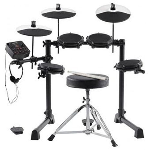 Alesis DEBUTKIT - Batterie électronique avec peaux maillées. Un kit de batterie électronique complet dans une seule et unique boîte. La Debut Kit est livré avec absolument tout ce dont vous avez besoin pour commencer à jouer de la batterie (casque, siège, 1 pair de baguette).